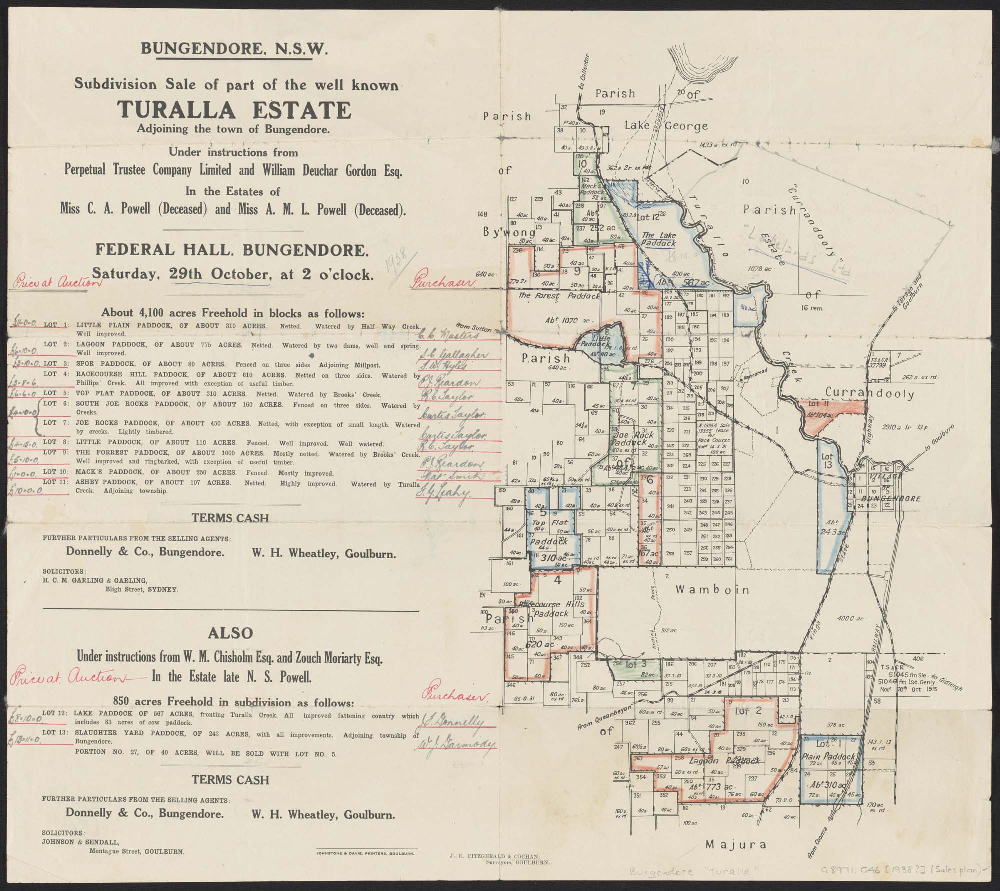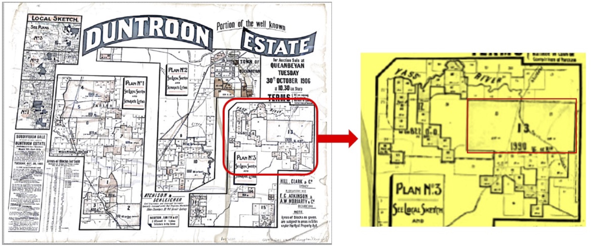 Hill, CC, E.G. Atkinson & A.W. Moriarty & Co 1906, Duntroon Estate: for auction sale at Queanbeyan Tuesday 30th October 1906 at 10.30 a.m. sharp, Hill, Clark & Co., auctioneers, Sydney in conjunction with E.G. Atkinson & A.W. Moriarty & Co., cadastral maps, Queanbeyan, https://nla.gov.au/nla.cat-vn7131814.