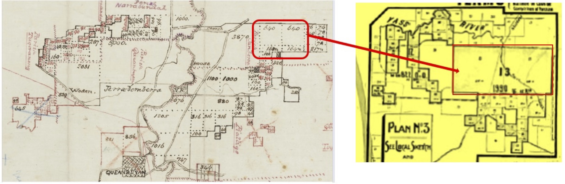 NSW Land Registry Services n.d., Historical Land Records Viewer, accessed 11 Feb. 2025, http://hlrv.nswlrs.com.au (parish of Wamboin map, Primary Application no. 14537).