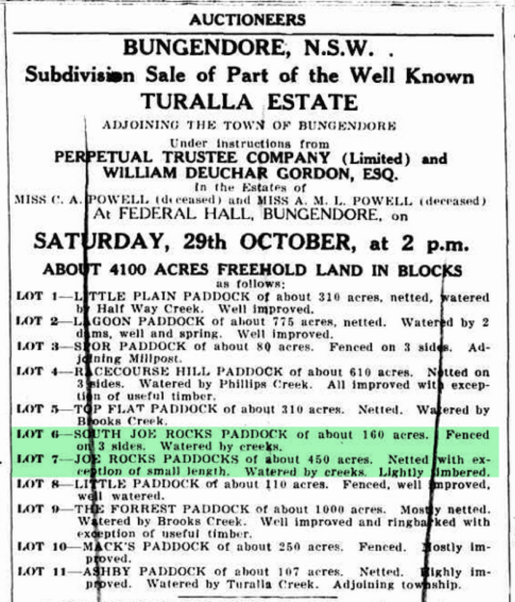 Scroggie and the other Trustees managed ‘Duntroon’ for two decades until the point came that Scroggie was the last remaining Trustee, and was responsible for finally executing Campbell’s wishes as set out in his will. A messy Campbell family dispute over George Campbell’s will ensued and, once it was settled in 1904 (‘In equity’ 1904), the decision was made to sell ‘Duntroon’—the land, homestead, stock, plant, etc.—at auction. The auction sale occurred on 30 October 1906 at Queanbeyan (‘Duntroon Estate’, 1906):